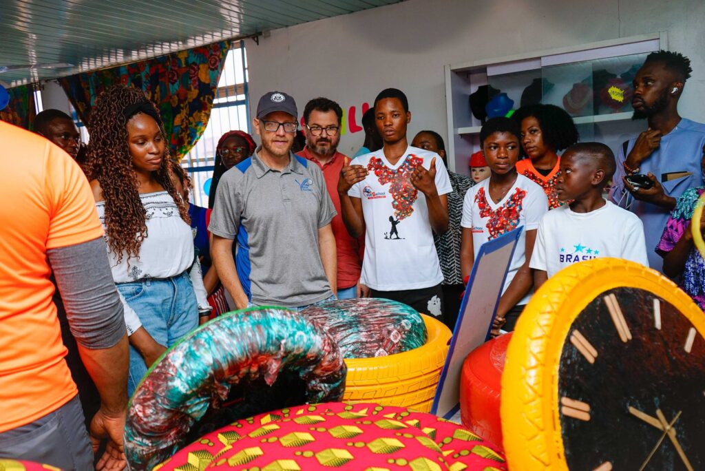 The Summer Skills program was built on Slum2School’s 7 Pillars methodology, ensuring each child’s potential is discovered and developed. From vibrant art pieces in the creative arts department to fashion showcases and culinary creations in the Home Economics department, where clothes were made out of old magazine papers, bagco sacs, and disposable cups. In the STEM department, where the kids had built moving buses and cars out of bamboo, torchlights, and drones; in the sustainability department, where we saw chairs and wall clocks made out of recycled tires, it was clear that these kids had poured their hearts into every project they had learnt over the past months. The creativity on display amazed the visitors, with Stevens commenting on how deeply moved he was by the talent level of Makoko and the outstanding support and belief Slum2School Africa has shown them.